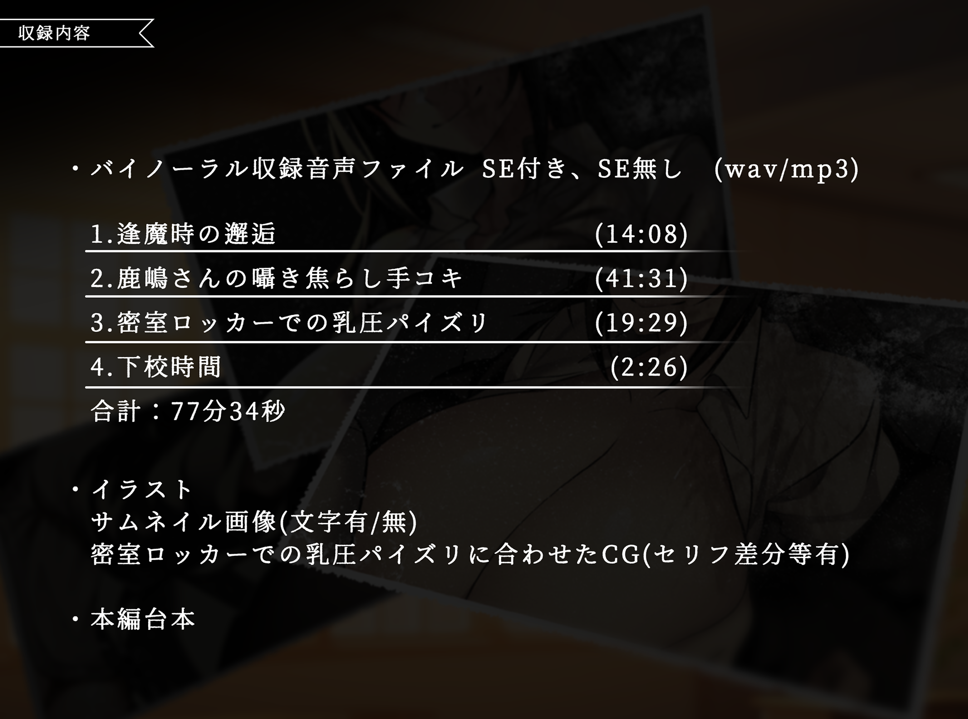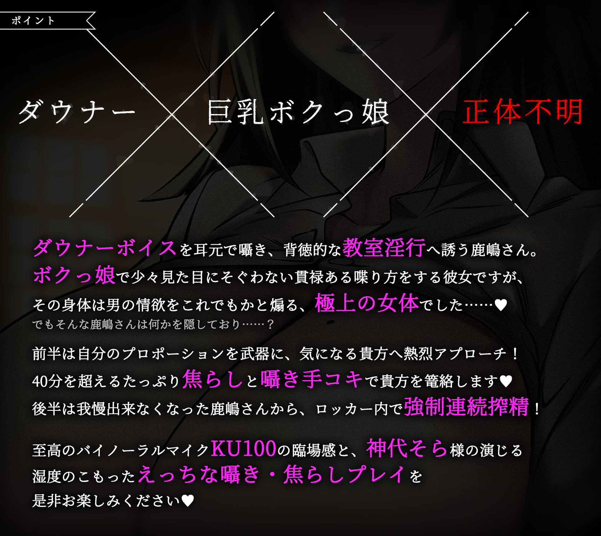 音声作品:【ダウナーボイス】胡乱なクラスメイトの鹿嶋さんと逢魔時えっち のロゴデザイン、グラフィックデザイン、シナリオライターを担当。 メインビジュアルはHz様が担当、CVは神代そら様が担当されています。 / 逢魔時+怪異+R-18+学校 /