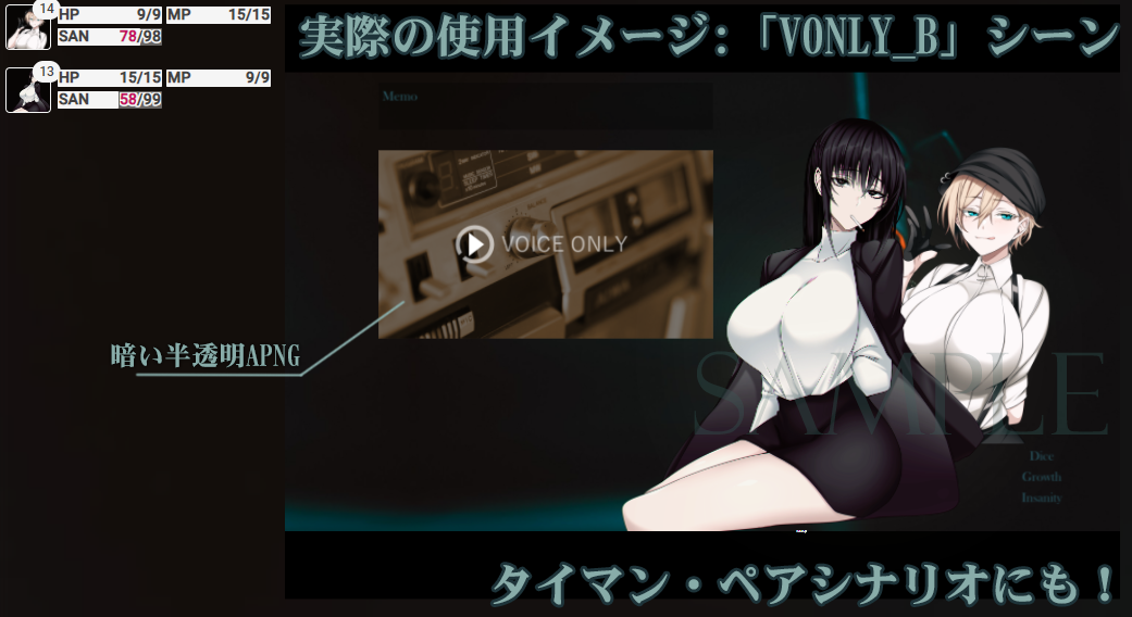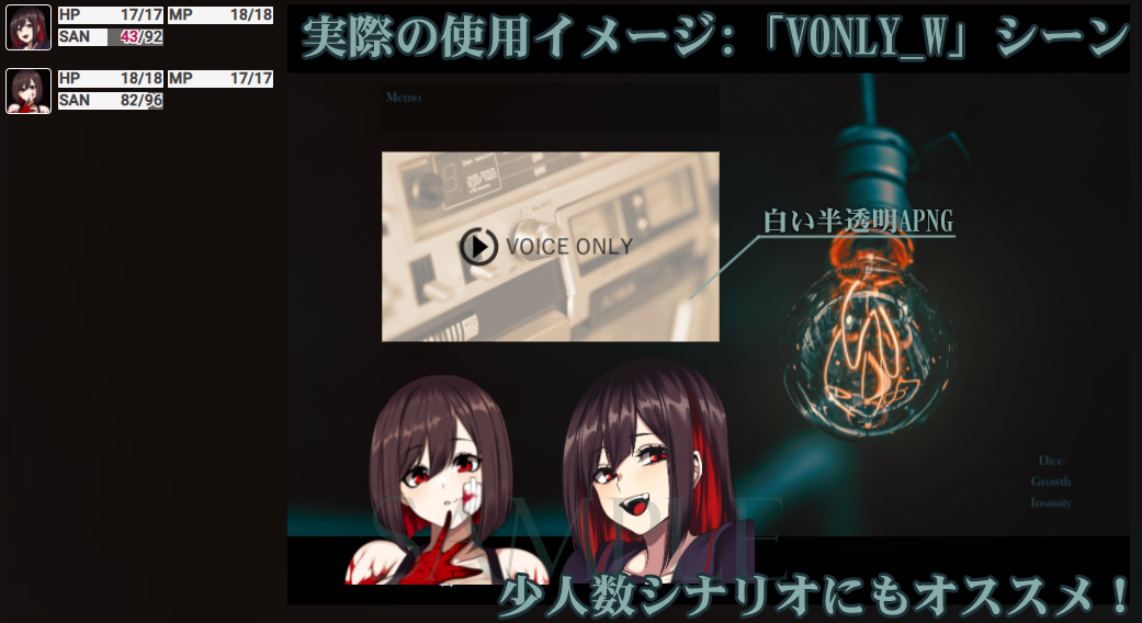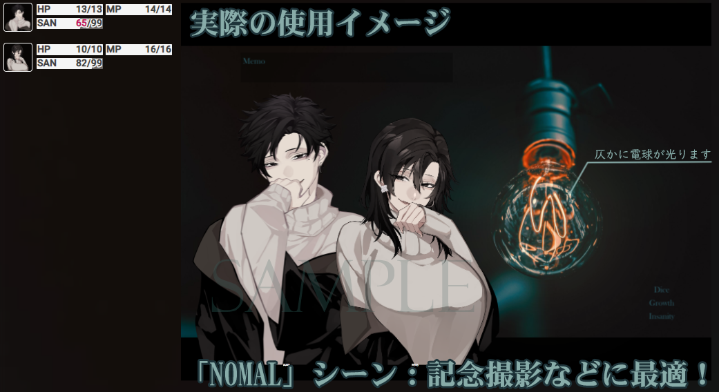 ココフォリアでの使用を想定した装飾素材です。 / メランコリック+電球 / Hz様、仈號ネオ様に立ち絵をお借りしております。
